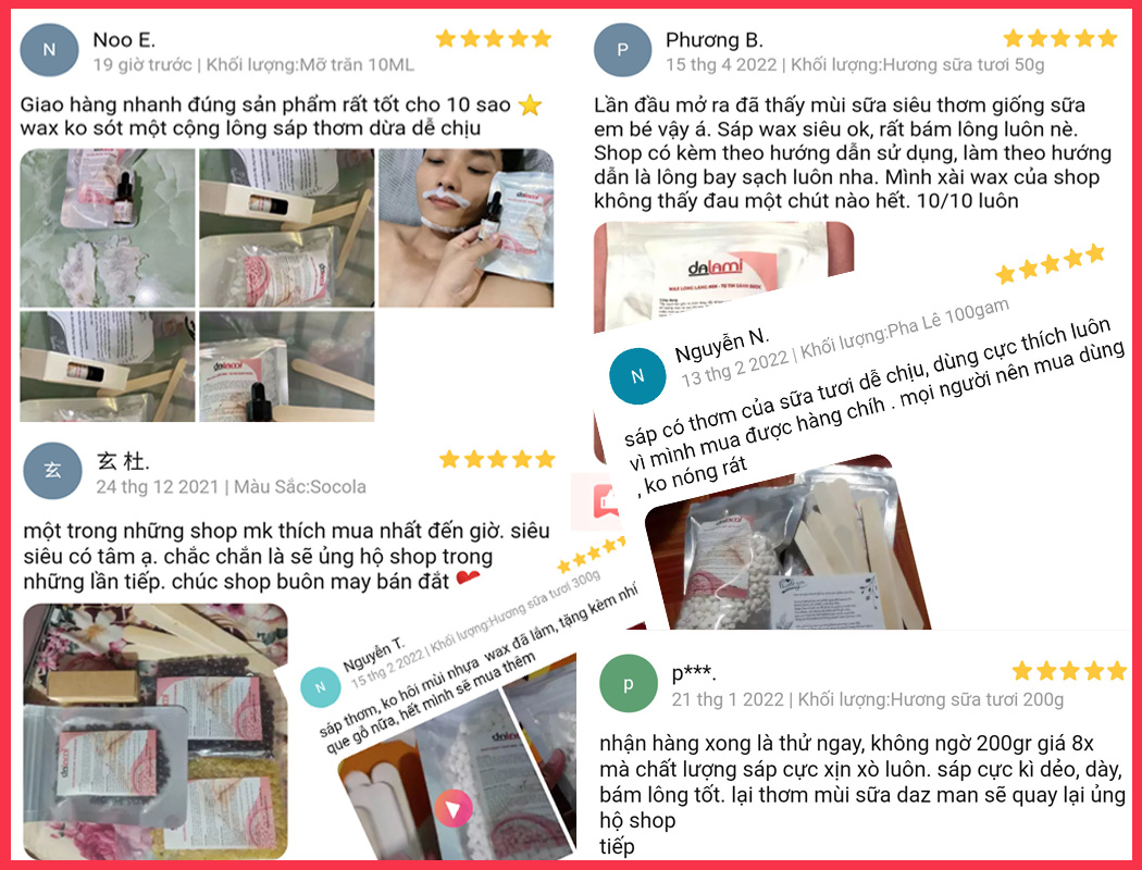 Đó chỉ là sự thật của một phần rất nhỏ những phản hồi tích cực đến bất ngờ. Những lợi ích khi sử dụng sáp wax lông Dalami hương sữa tươi jade có chất lượng cao và sự phục vụ của chúng tôi cho mọi khách hàng kể ra còn rất dài...